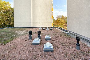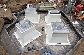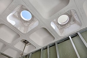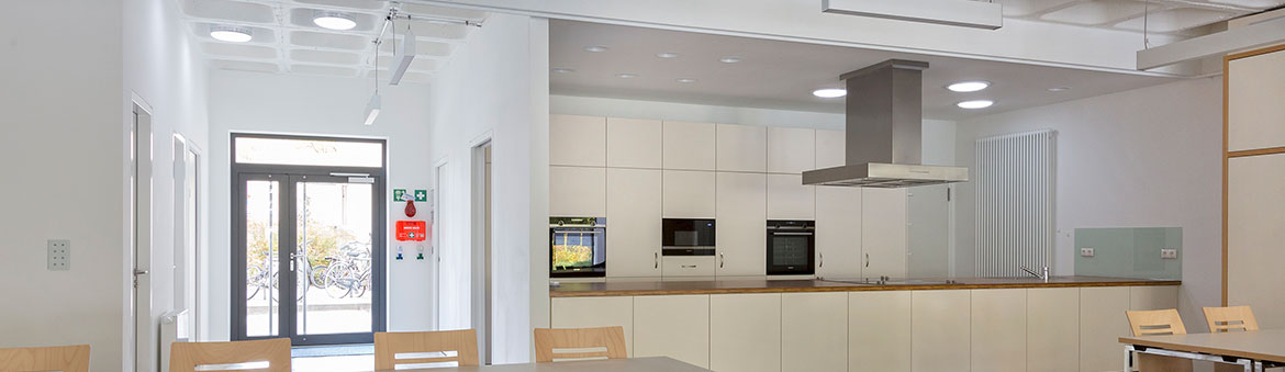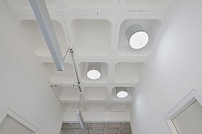 Insgesamt acht Tageslichtspots sahen die Architekten zur Belichtung vor: Zwei in den neu angelegten Toilettenräumen, drei im Flur sowie drei weitere für eine offene Küche, die für Events genutzt werden kann. Zur Installation galt es mittels Kernbohrer für jeden lightube® eine Öffnung in die zehn Zentimeter dicke Betondecke zu stanzen. Während eine Außenkuppel mitsamt der Streuscheibe das Licht einsammelt, sorgt ein Aufsetzkranz aus PVC für die Abdichtung der Spots – und darüber hinaus auch dafür, dass die anspruchsvollen energetischen Vorgaben eingehalten werden.