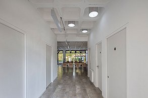 Der rechteckige Flachbau aus den späten 1960er Jahren verfügt über eine Fläche von rund 165 Quadratmetern, die von einer zu dieser Zeit typischen Stahlkassetten-Decke überspannt wird. Um für die neue Nutzung als Begegnungsstätte möglichst viel Tageslicht einzubringen, wurde ein Teil der Fassade komplett verglast. Aufgrund der erheblichen Tiefe des Raumes war es zudem unabdingbar, zusätzliches Licht über die Decke in das Gebäudeinnere zu leiten. Konventionelle Oberlichter kamen dafür nicht in Betracht, da dies aufwändige Eingriffe in die Statik der Rasterdecke zur Folge gehabt hätte. Die Tageslichtspots lightube® von ESSERTEC passten hingegen wie maßgeschneidert zur Rasterung. Sie konnten mittig in die jeweiligen Kassetten montiert werden.