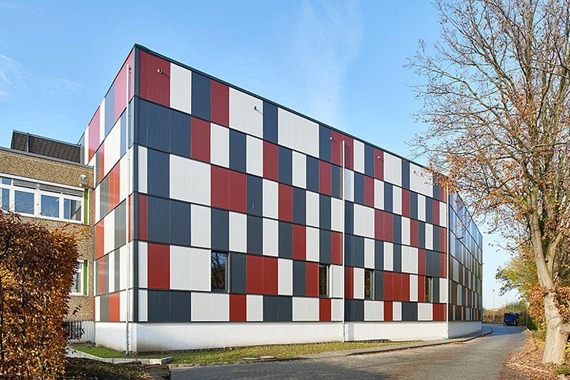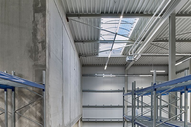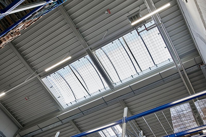 Der neue Anbau sollte zwei sehr unterschiedliche Nutzungen in einem Gebäude verbinden: Zum einen die bisherige Lagerhalle vergrößern und zum anderen auch Platz für sportliche Aktivitäten schaffen. Umgesetzt hat es die Firma Stahlbau Wurst nach einem Entwurf von Schmale Architekten aus Grevenbroich, die durch eine farbige Fassadengestaltung den Charakter des angrenzenden 70er Jahre Baus verstärken. Die insgesamt knapp 1.500 Quadratmeter erstrecken sich auf zwei Geschosse, wobei sich die Sporthalle im ersten und die Lagerhalle im zweiten Geschoss befinden. Für ausreichend Tageslicht in den tiefen Räumen sorgen sowohl esserlux® Lichtbänder als auch essertop® Lichtkuppeln und fumilux® Rauchabzüge. Um gemäß der Brandschutzverordnung im Brandfall eine sichere und zügige Entrauchung zu gewährleisten, wurden vier elektrische Rauch- und Wärmeabzüge fumilux® 4000 EAZ eingesetzt. Der Durchsturzschutz esserprotect® in allen Oberlichtern bietet bei Wartungsarbeiten auf dem Dach nicht nur den nötigen Absturzschutz für Personen. Er dient darüber hinaus auch als Schutz der Verglasung vor Ballwürfen in der Sporthalle. Für die tägliche Be- und Entlüftung der neuen Hallen sorgen die Lichtkuppeln mit integriertem Elektroöffner wie auch die elektrisch betriebenen Rauchabzüge.
