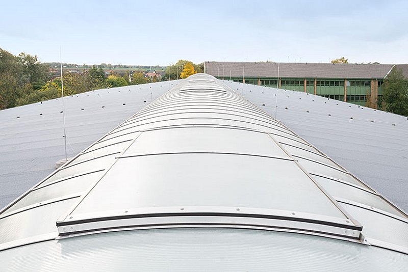 Sechs Einzelklappen zur Entrauchung sorgen für die nötige Sicherheit im Brandfall. Durch die integrierten Elektro-Öffner können sie zudem zur täglichen Lüftung eingesetzt werden. Als Schutz gegen Absturz von Personen durch das Lichtband wurde ein esserprotect® Durchsturzschutzgitter integriert, das gleichzeitig als Ballwurfschutz im Rahmen der Nutzung der Sporthalle dient. Die optisch ansprechende Pearl Inside® Polycarbonat-Verglasung sorgt darüber hinaus für eine besonders hohe Schalldämmung. Im Vergleich zu herkömmlichen Doppelverglasungen mit gleichen akustischen Eigenschaften bieten Pearl Inside® Verglasungen den Vorteil des deutlich geringeren Gewichts.