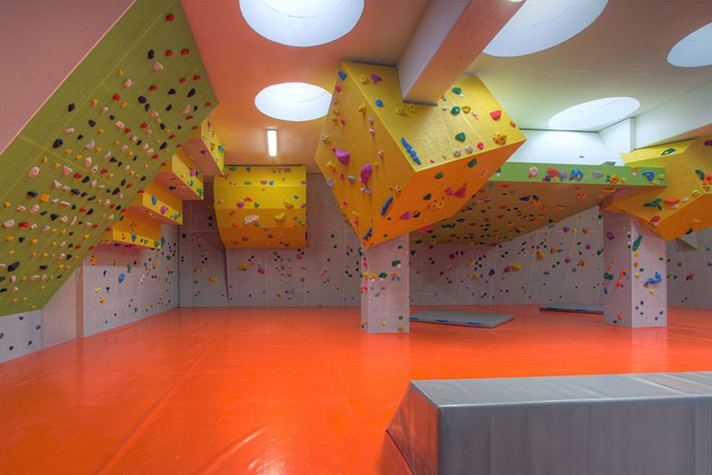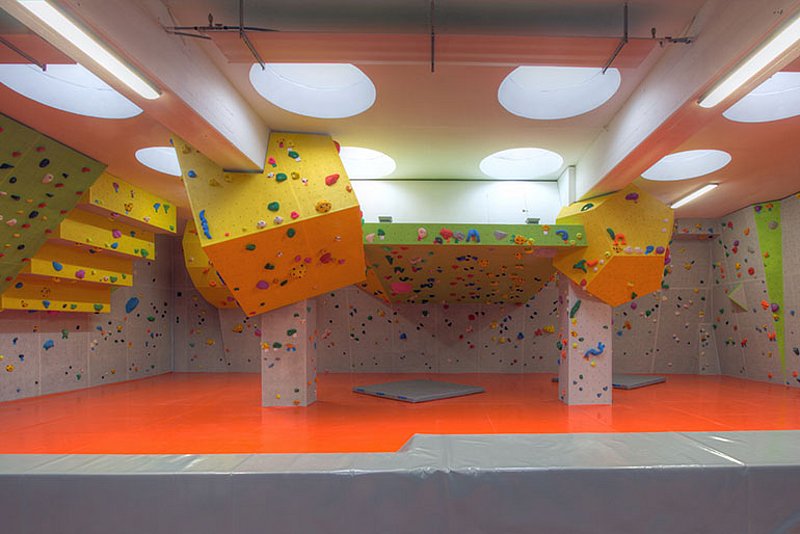 Moderne Standards galten auch für die aufwändig konstruierten Kletterwände, die mit ihren Rissen, Spalten und Überhängen ein Klettererlebnis der besonderen Art bieten. Wem das noch nicht genug Adrenalin in die Adern treibt, der kann in 13 Meter Höhe über Kopf im Bogen nah der Hallendecke entlang klettern.