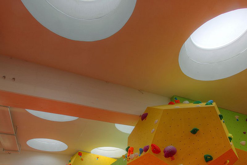 Während die große Kletterhalle selbst mit elektrischem Licht versorgt wird, gewährleisten insgesamt 16 Lichtkuppeln eine natürliche Beleuchtung von oben in einem zweiten, Ende 2011 fertiggestellten Kletterbereich. Die erneuerten Lichtkuppeln mit rundem Grundriss wirken als markante Lichtflecke wie Bullaugen in der Decke. Im Sinne des architektonischen Anspruchs erwiesen sich die deutlich über den üblichen optischen Standards liegenden runden Lichtkuppeln genau als die richtige Lösung. Sowohl in der starren Ausführung als auch in der zweimal ausgeführten lüftbaren Variante. Für einen zeitgemäßen Wärmeschutz wurde ein 3-schaliger Kuppelaufbau aus opalem Kunststoff gewählt, der das Tageslicht blendungsfrei und gleichmäßig streut.